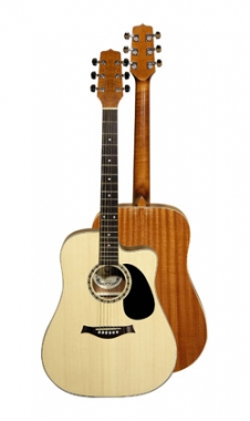 Верхняя дека - отборный массив елиНижняя дека - красное дерево, обечайка - клёнГриф - клён под красное деревоНакладка и подставка - палисандрРозетка - переводная картинкаКолки - никельСтруны - металлические