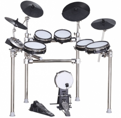 Рама выполнена из алюминия, на 4-х ногах, довольно прочная и надежная, имеет простой принцип сборки. Установка состоит из одного двухзонного пэда малого барабана, одного пэда бас – барабана на 8 дюймов, четырех пэдов тарелок (с возможностью глушения и с колоколом), пэды томов – 4 шт, 1 пэд хай – хэта, пятиуровневая педаль хай хэта, отдельная, педаль бас – барабана, палочки 2 шт. Звуковой барабанный модуль обеспечивает широкий набор тембров, функций и регулировок, снабжен 4-полосным эквалайзером, USB-портом, слотом для карт SD.