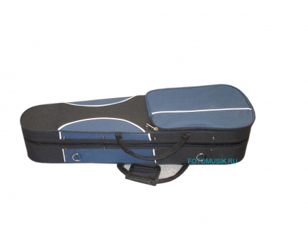 Футляр для скрипки. Жесткий легкий тканевый контурный футляр под форму инструмента с двумя ремнями (можно носить как рюкзак), внешний карман для нот, 2 держателя для смычков, цвет - комбинированный (черный/синий). Внутренняя отделка кейса: бежевый/синий велюр с накидкой для скрипки, карман для аксессуаров. Размеры: 1/8