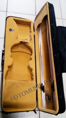 Футляр для скрипки прямоугольный. Внешняя отделка:Жесткий контурный футляр с двумя ремнями, двумя ручками, с карманом, цвет верха - черный. Внутренняя отделка кейса: желто-золотистый велюр, два отделения: для канифоли и мостика, крепления для двух смычков Размеры: 4/4
