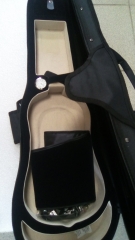 Жесткий трапецивидный футляр с гигрометром, облегченный, с отсеками для мостика и двух смычков, с удобными двумя ремнями. Можно носить на плече или как рюкзак. Внешняя отделка: черная ткань с прострочкой, ручками и молнией. Небольшой внешний отсек для нот. Внутренняя отделка кейса: комбинированная темно-синий/золотистый велюр с накидкой для скрипки Комплектность: кейс для скрипки, ремни, накидка для скрипки Размеры: 4/4